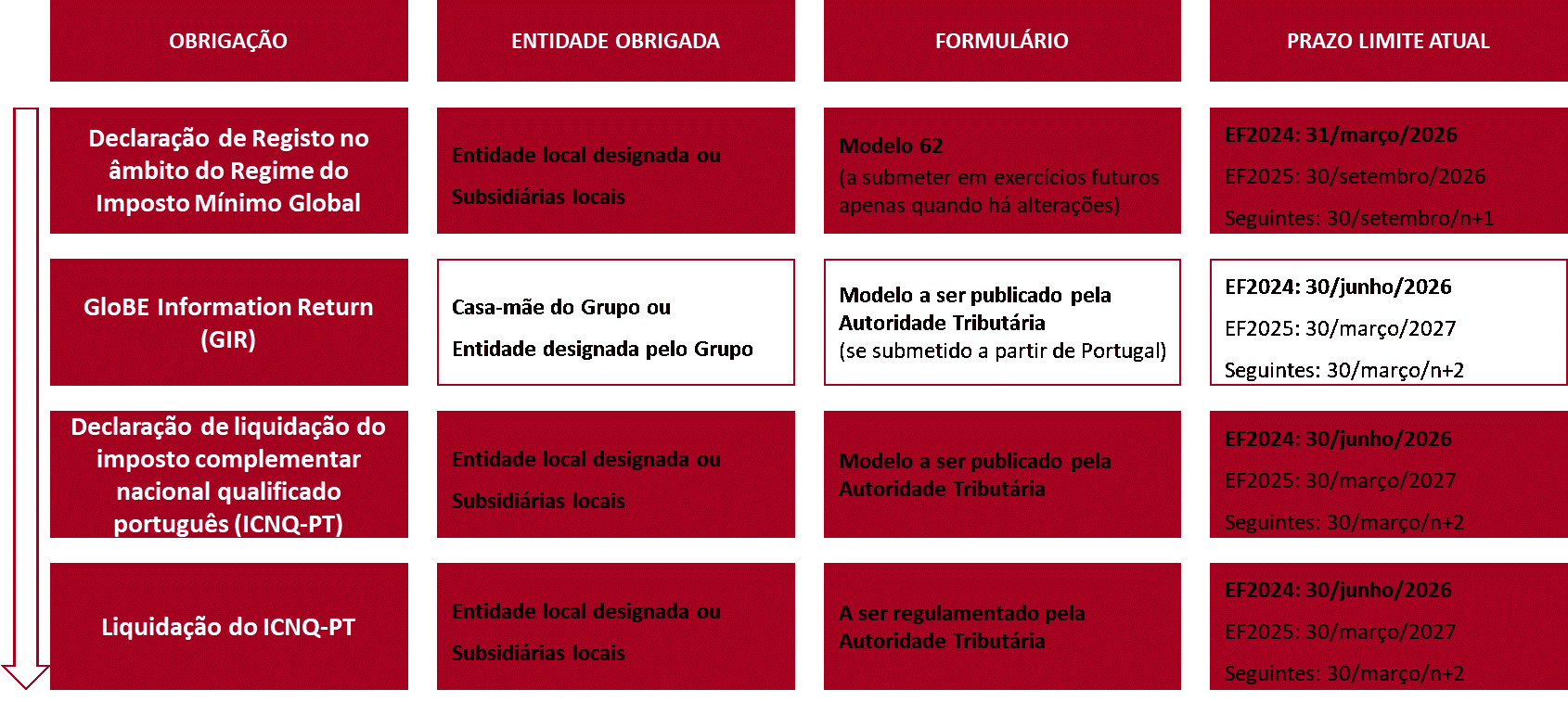 A presente comunicação tem natureza meramente informativa e pedagógica, não constituindo um parecer técnico, aconselhamento fiscal ou consultoria fiscal. Atendendo à extrema complexidade do Regime do Imposto Mínimo Global (Pilar II) e à volatilidade da regulamentação e dos prazos associados recomendamos que obtenham aconselhamento especializado junto de consultores fiscais especializados nestas matérias. Não assumimos qualquer responsabilidade pelas decisões tomadas pelas Empresas ou pelas suas casas-mãe com base nesta informação.